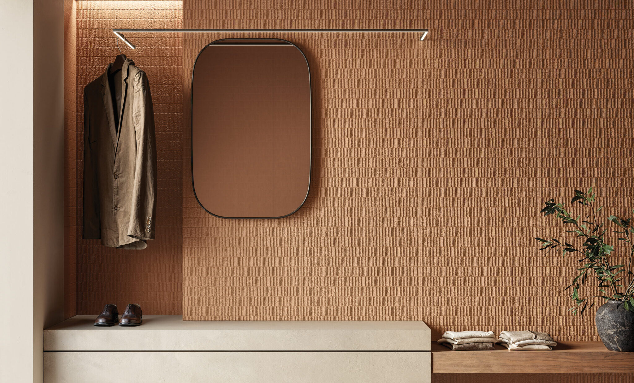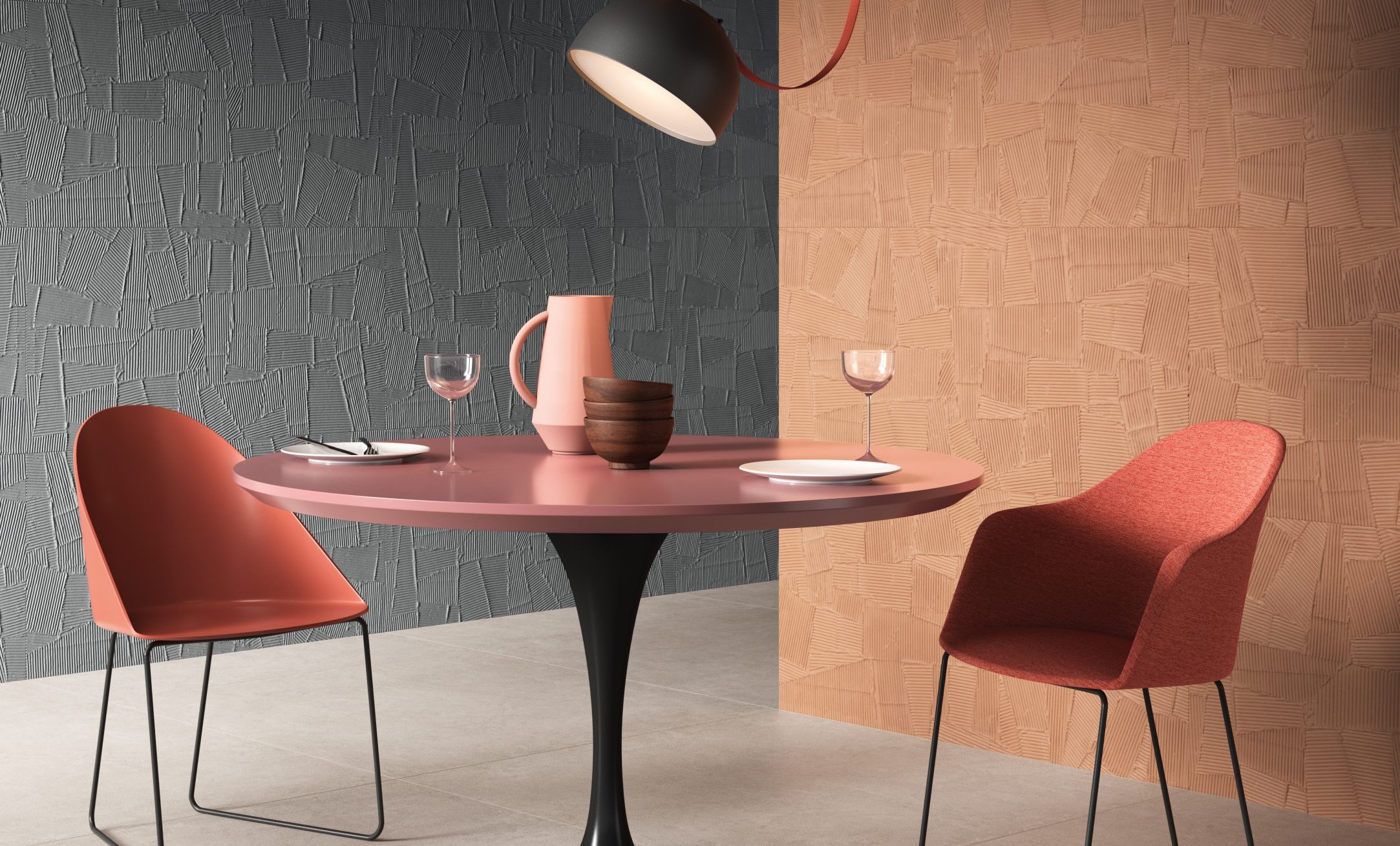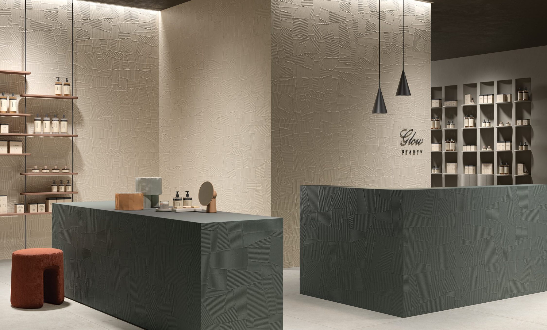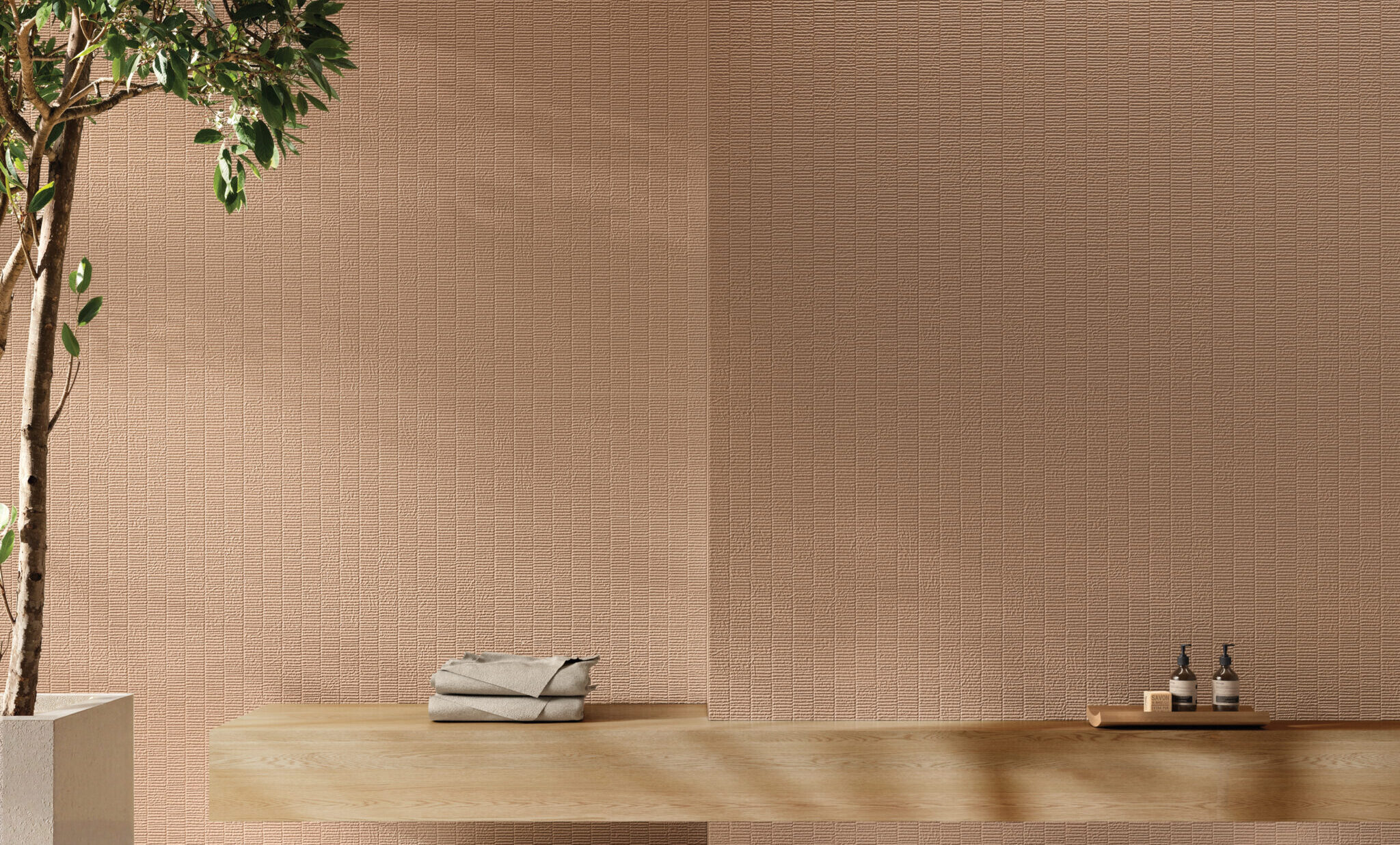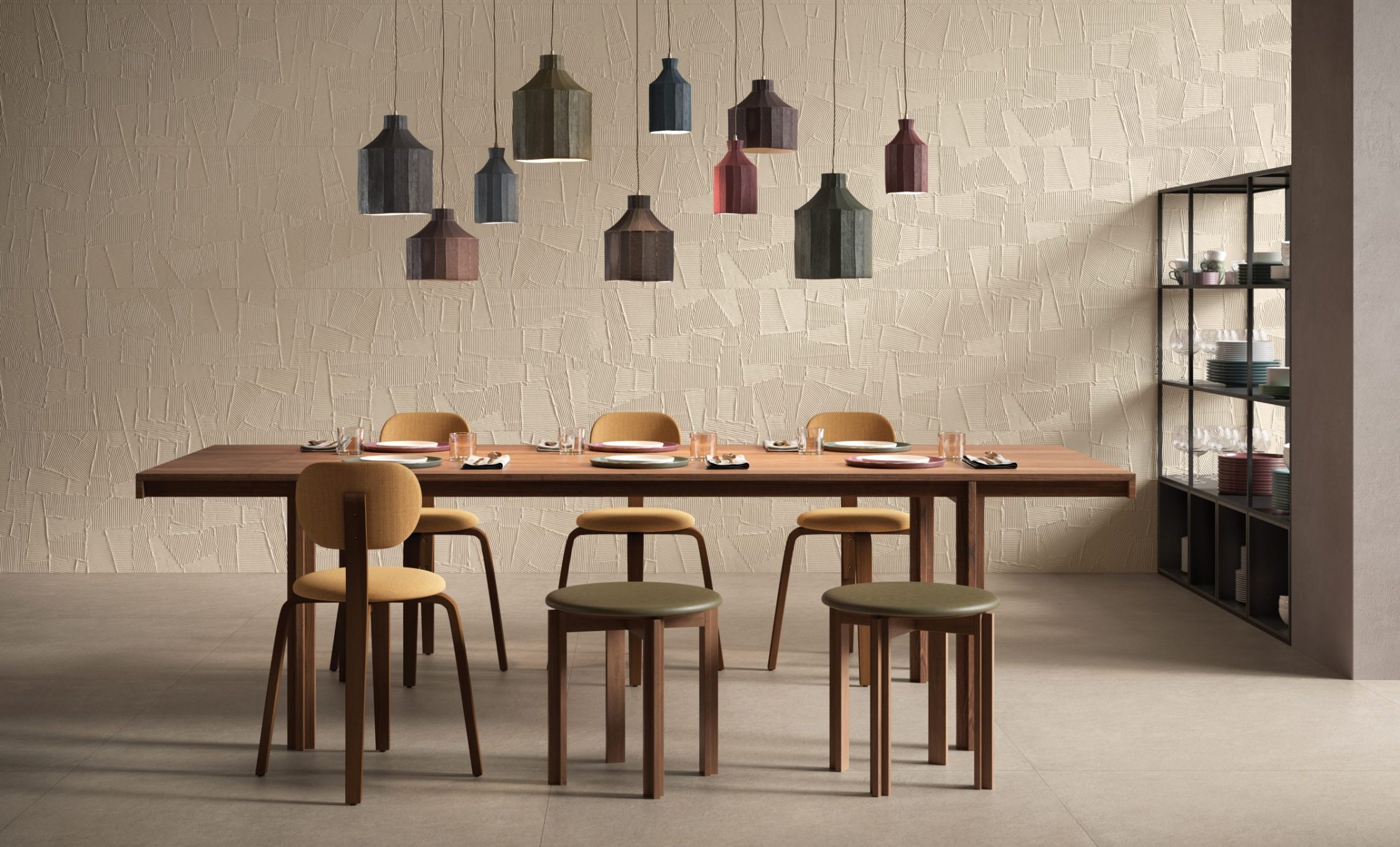 HOMEY arises by the idea of obtaining natural-looking surfaces inspired by the earth, specifically clay with its warm colors and shades ‘ton sur ton’ obtaining a soft surface, ideal for a warm and cozy home. From the clay, pressed in established forms, then dried and fired, are created the bricks of various architectural ornaments used in construction. The Homey collection draws inspiration from these elements and presents two tridimensional textures, a brick shaped (Stripes) available either matte and glossy finish, one with triangular geometries (Canneté) recalling the contemporary wooden boiseries and one celebrating the excellence of Italian handcraftmanship (Paper Clay).