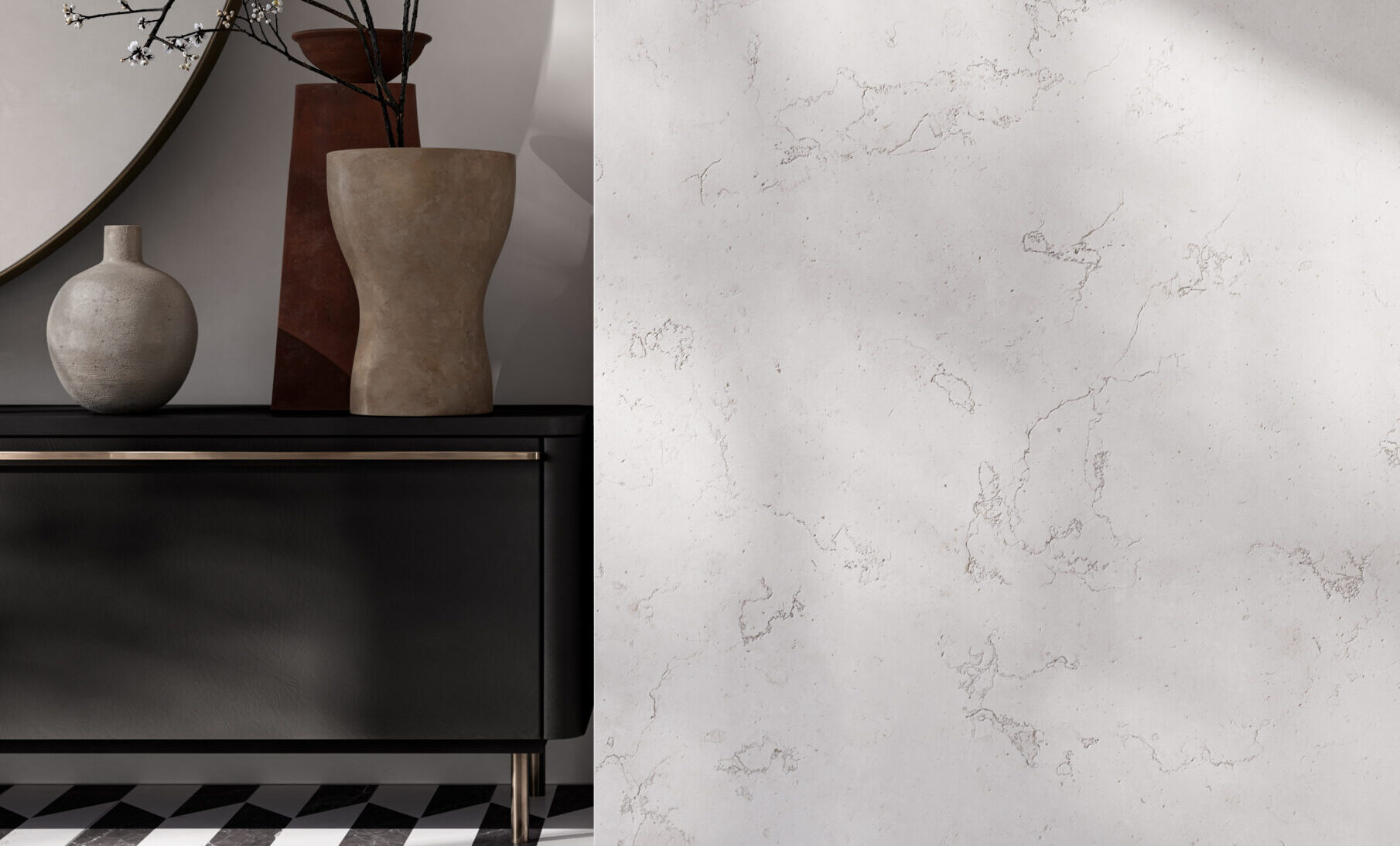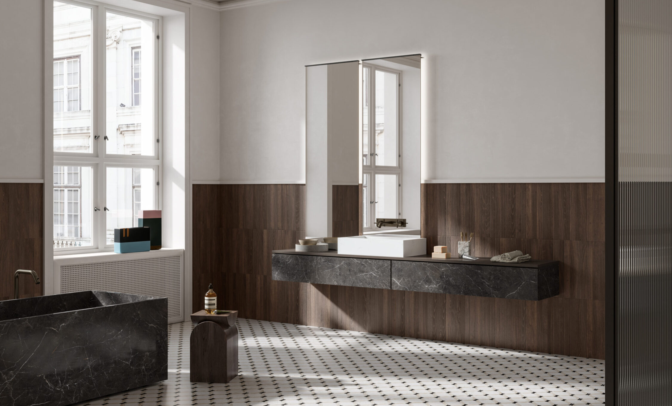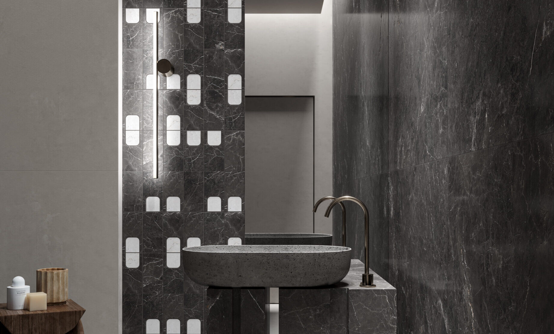 MATERIA VIVA takes shape from two marbles that interpret light and depth: Biancone, bright and essential, and Mistik Brown, warm and enveloping. Together they create balance, elegance, and authenticity in every space. The 3D HONED finish enhances visual and tactile depth with a soft, satin touch. Decorative elements introduce rhythm and architectural compositions. A timeless material language, designed for contemporary architecture.